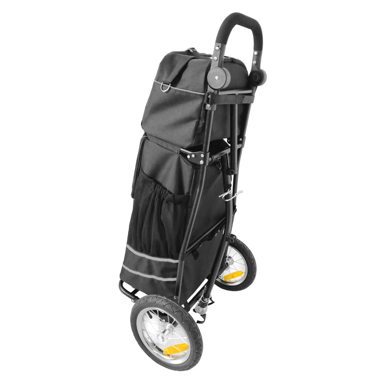 Vous pouvez également utiliser le caddie sans les sacs à la manière d’un diable, pour transporter des charges lourdes, comme des caisses ou des cartons de déménagement. Le châssis a une structure en aluminium, à la fois léger, stable et robuste, lui permettant de porter jusqu’à 22 kilos. De plus, le chariot est doté de roues 12 pouces avec rayons en aluminium et pneus Kenda avec chambre à air.